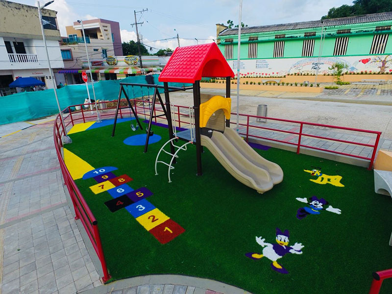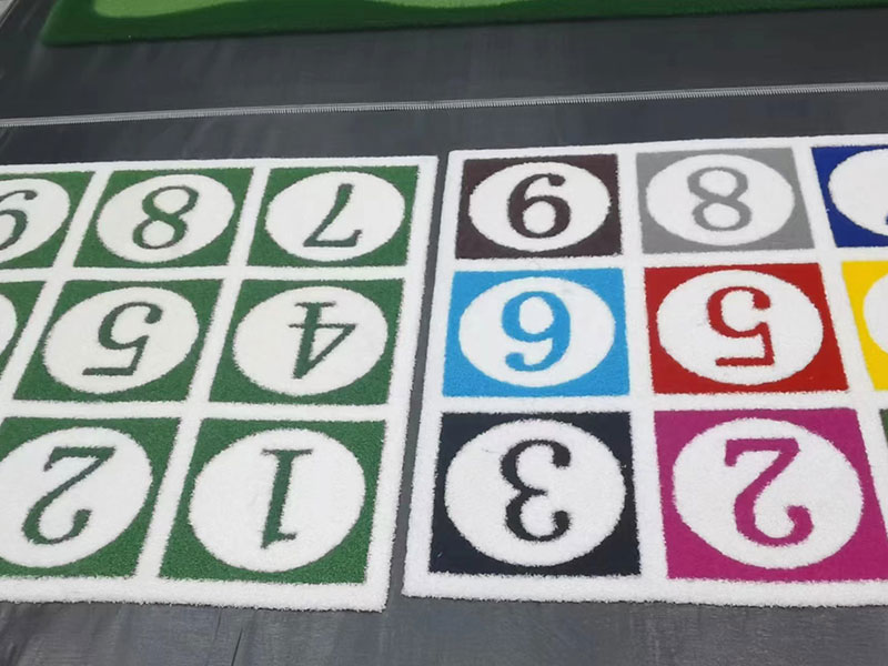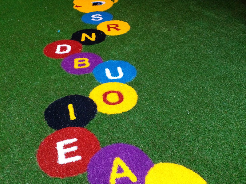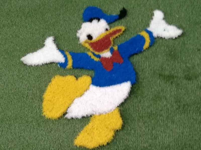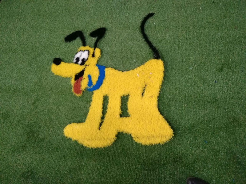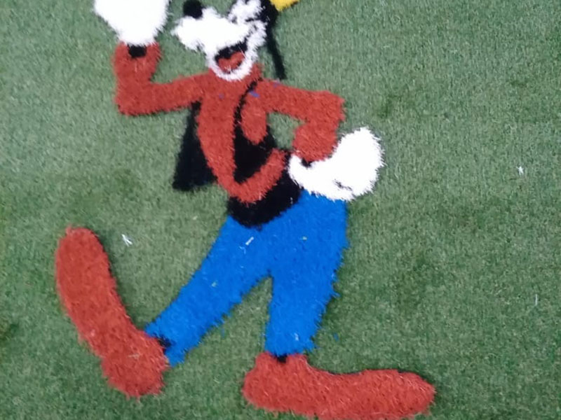 人工芝をパターンに合わせて型抜きをしました。公園、プレイグラウンド、幼稚園など子どもたちが安全に遊ぶことができるエリアを作り上げます。当社の高品質人工芝は、清潔で柔らかい芝の質感ですので子どもたちは自由に安心して遊ぶことができます。