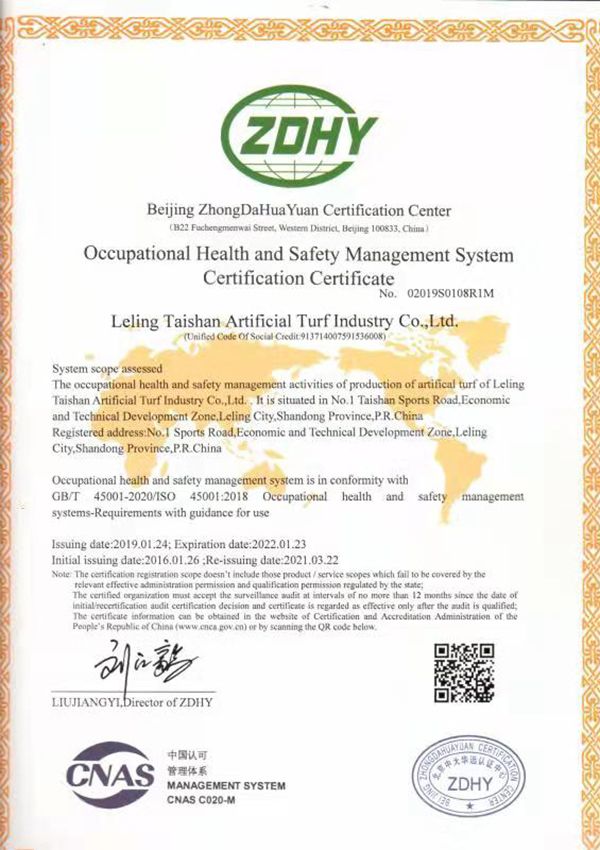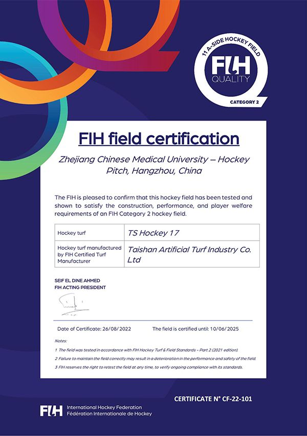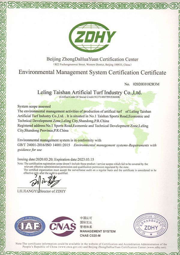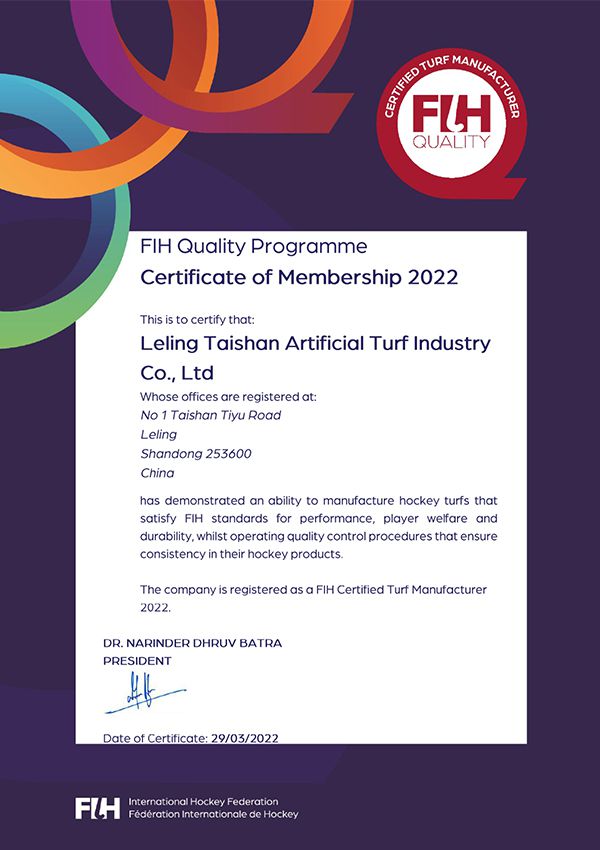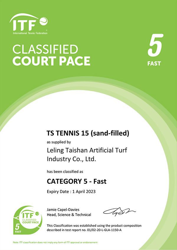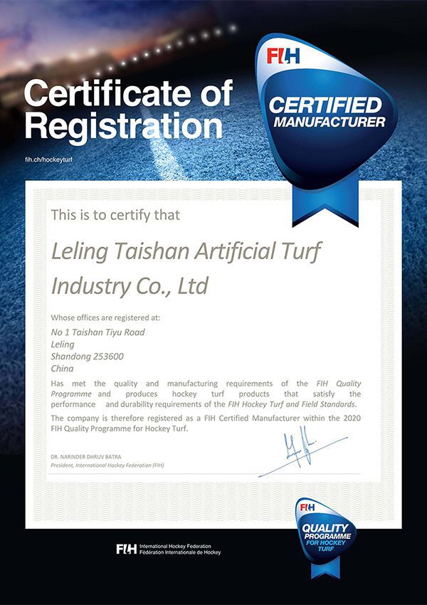 Taishanは中国の環境マネジメントのパイオニアとして、ISO9001品質マネジメントシステムとISO14001環境マネジメントシステムを取得しました。人工芝メーカーの中で品質と生産量において世界トップクラスのシェアを誇ります。ITF、EN、ASTM、DIN、RoHS NSCC CE国際基準に準拠しており、国際テニス連盟、ワールドラグビー、国際サッカー連盟から公式認証を獲得しています。FIFA前会長のブラッター氏は、当社の人工芝を非常に耐久性が高く天然芝と引けを取らないと賛辞しました。